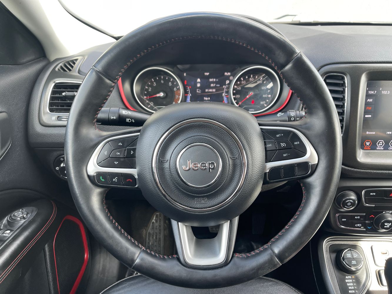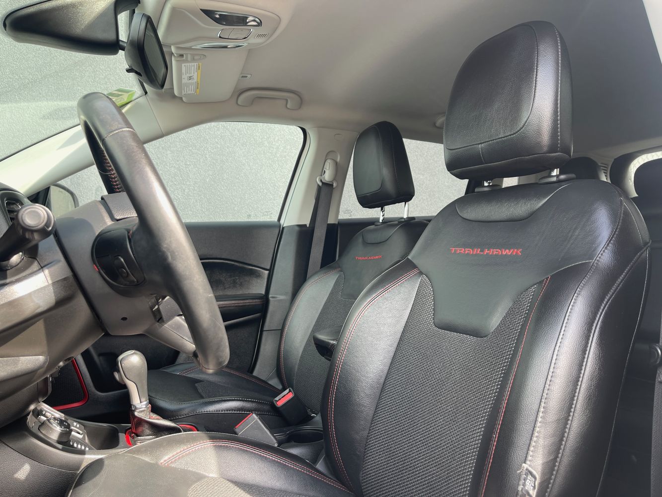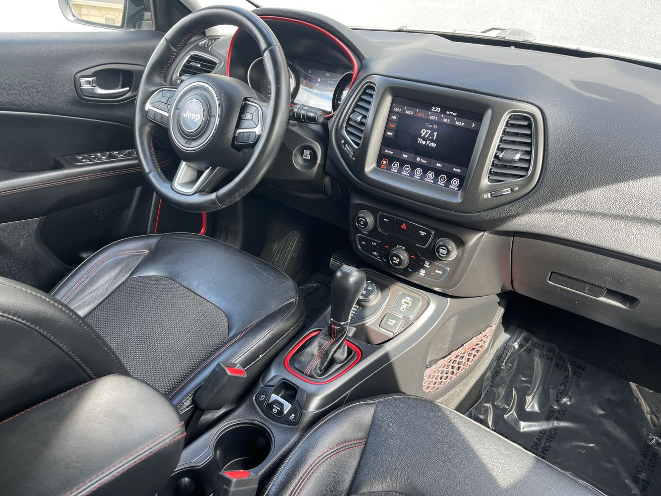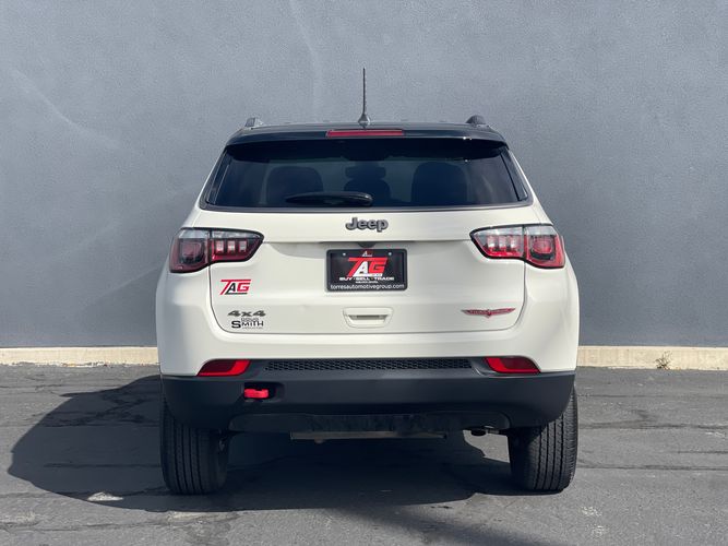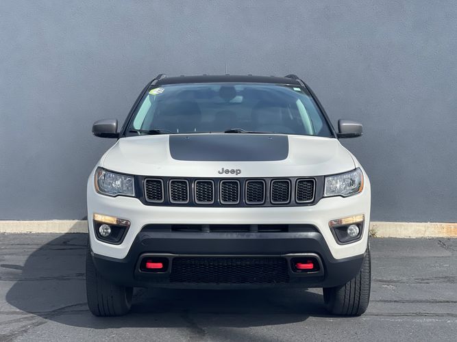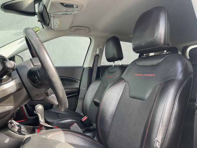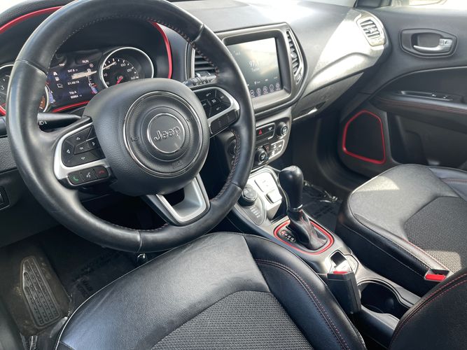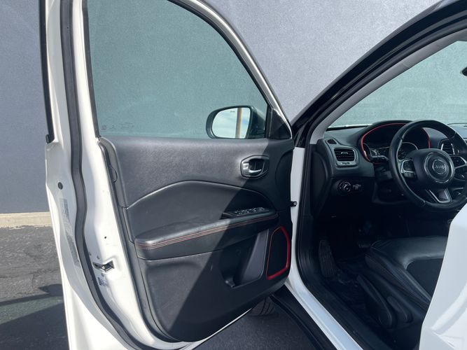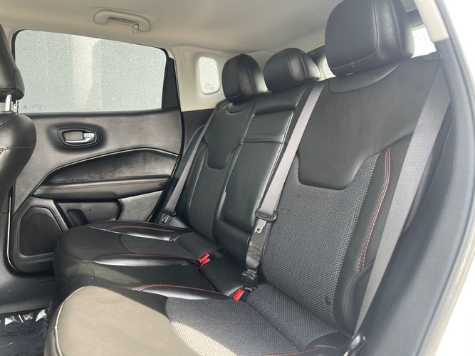 The 2019 Jeep Compass Trailhawk 4x4 is a striking adventure-ready SUV, cloaked in an elegant White Clearcoat that underscores its rugged capability. Its aggressive stance is complemented by the signature red tow hooks and distinctive Trailhawk badging, not only embracing the classic Jeep DNA but also setting it apart in any environment. The bold exterior design flows seamlessly into the cabin, where the Ruby Red and Black interior color scheme injects a sense of style and sportiness.