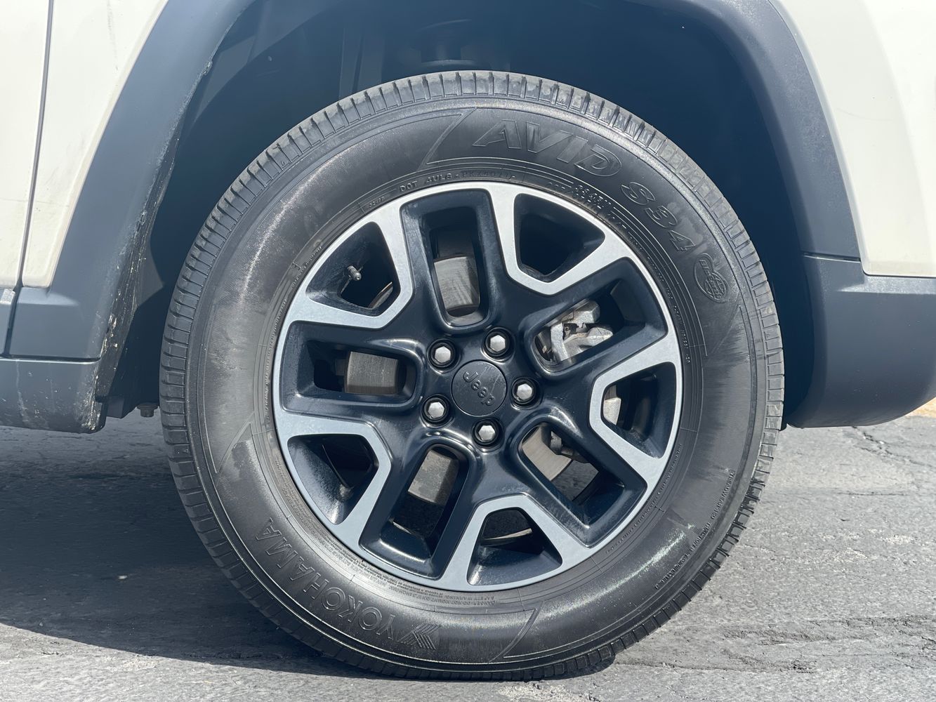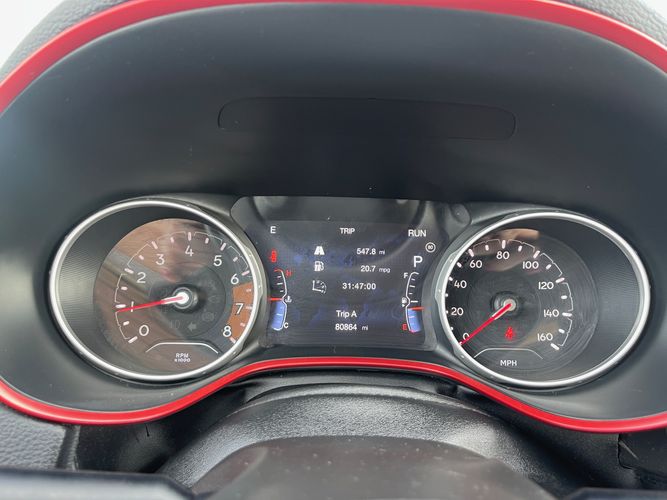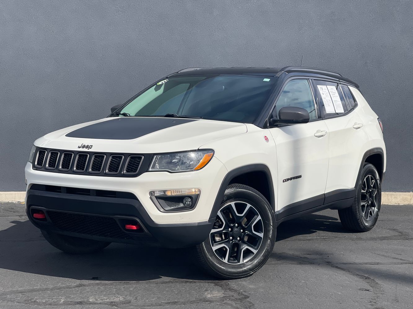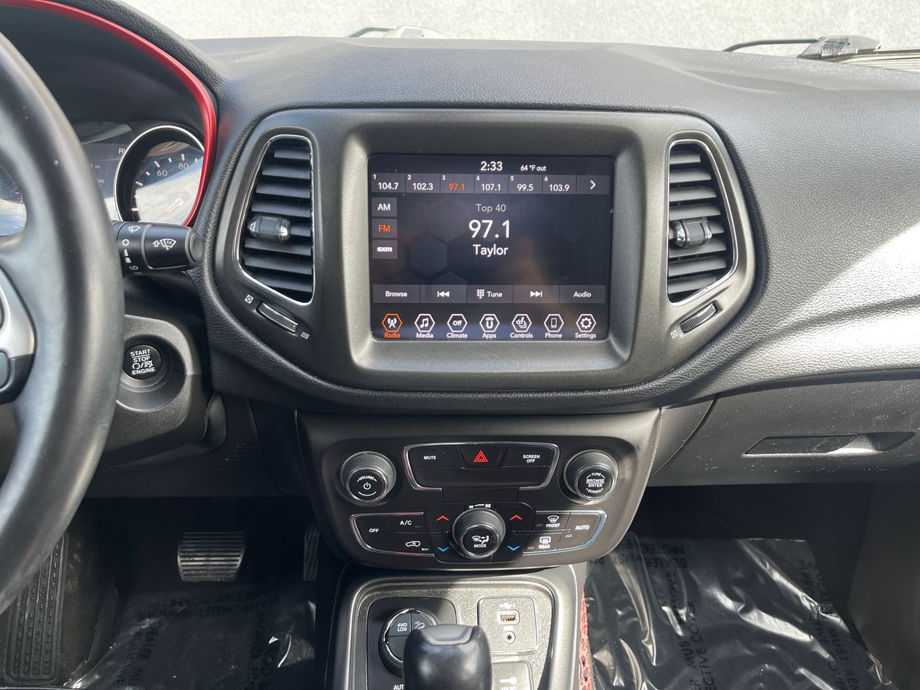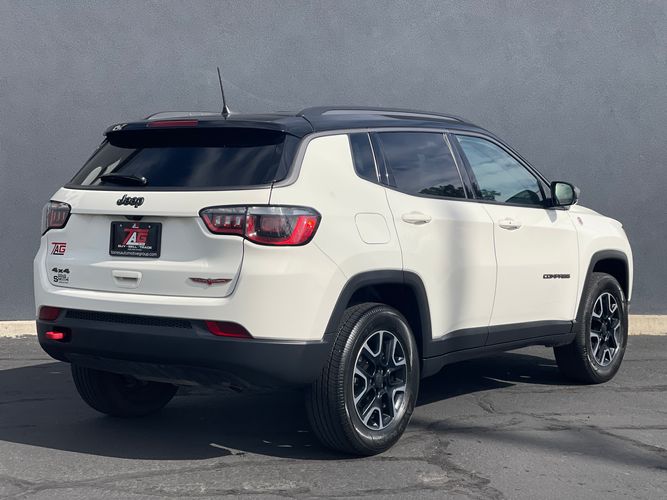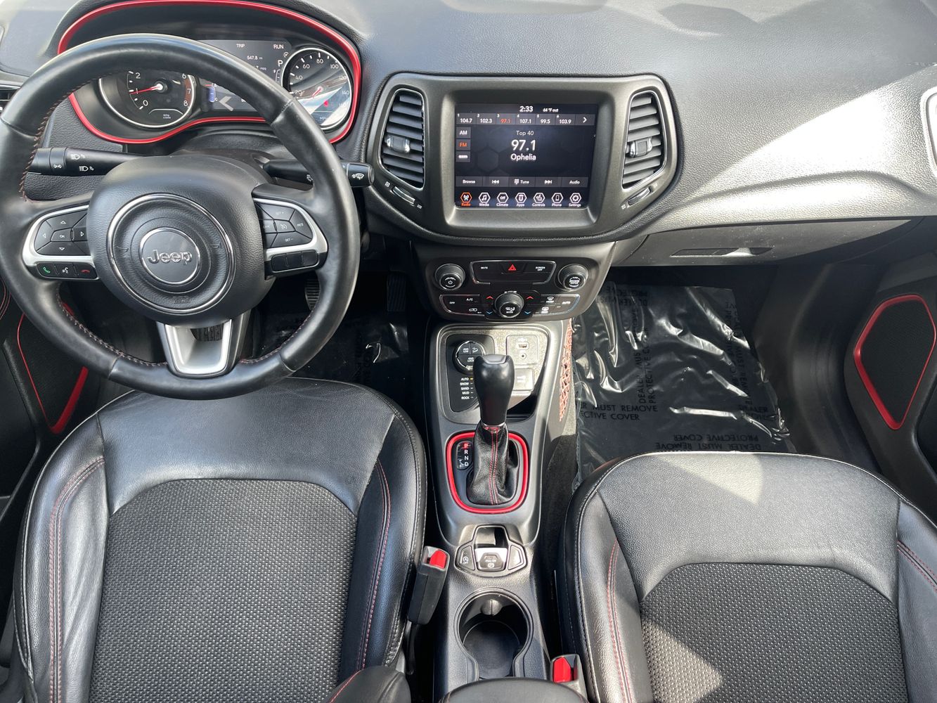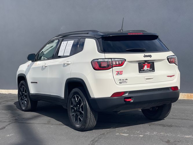 The 2019 Jeep Compass Trailhawk 4x4 is a striking adventure-ready SUV, cloaked in an elegant White Clearcoat that underscores its rugged capability. Its aggressive stance is complemented by the signature red tow hooks and distinctive Trailhawk badging, not only embracing the classic Jeep DNA but also setting it apart in any environment. The bold exterior design flows seamlessly into the cabin, where the Ruby Red and Black interior color scheme injects a sense of style and sportiness.