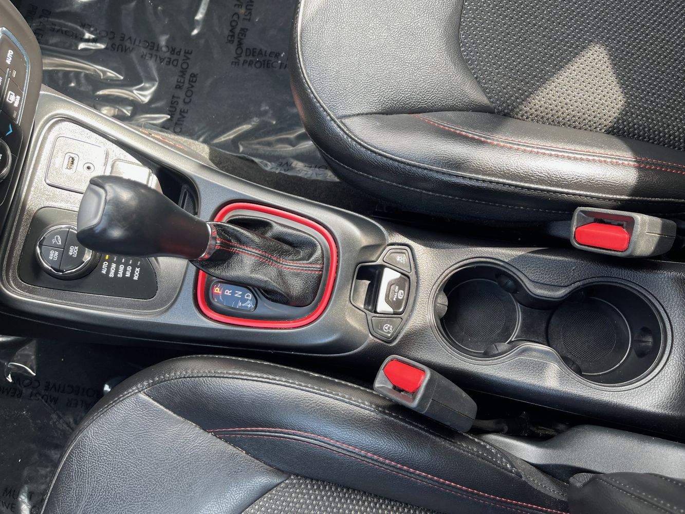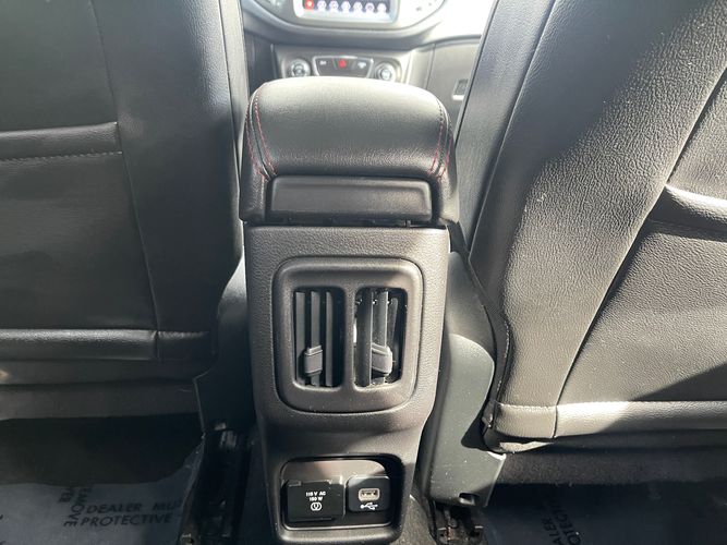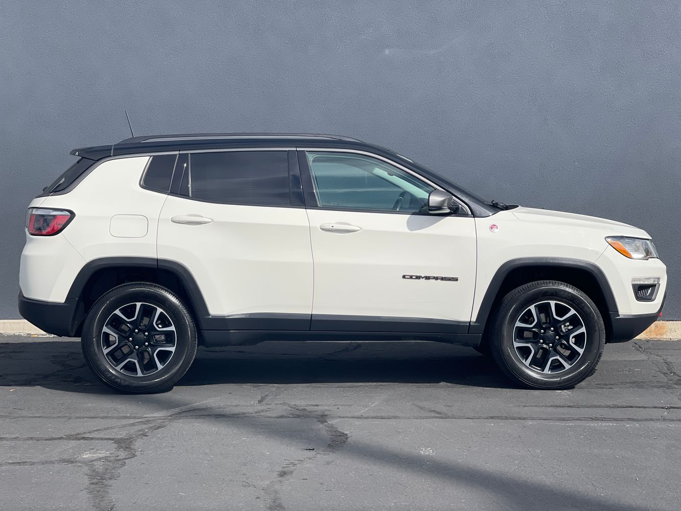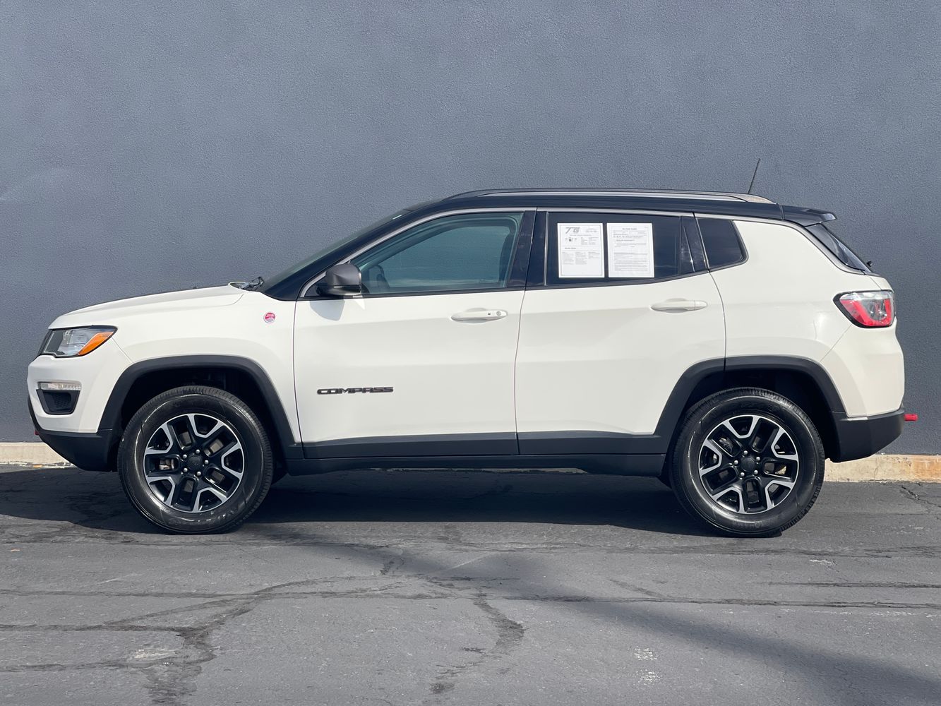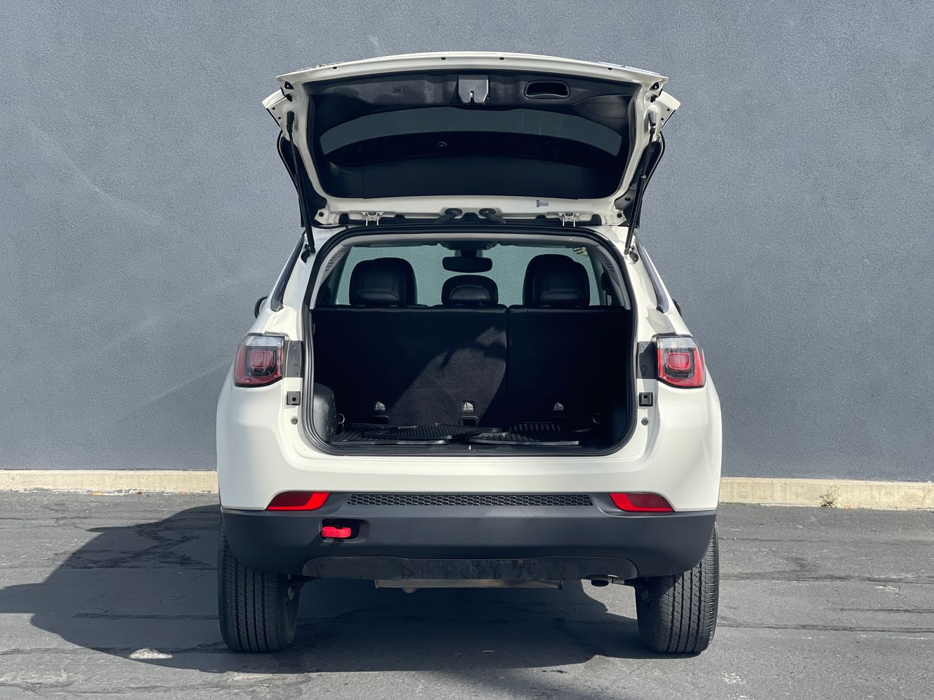 The 2019 Jeep Compass Trailhawk 4x4 is a striking adventure-ready SUV, cloaked in an elegant White Clearcoat that underscores its rugged capability. Its aggressive stance is complemented by the signature red tow hooks and distinctive Trailhawk badging, not only embracing the classic Jeep DNA but also setting it apart in any environment. The bold exterior design flows seamlessly into the cabin, where the Ruby Red and Black interior color scheme injects a sense of style and sportiness.