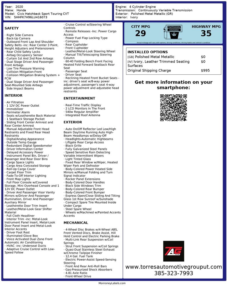 The 2020 Honda Civic Hatchback Sport Touring CVT is a vehicle that masterfully blends performance, style, and functionality. At the heart of this hatchback lies a robust 1.5L turbocharged 4-cylinder engine, delivering a spirited driving experience that matches its sporty exterior design. The Continuously Variable Transmission (CVT) ensures a smooth and responsive ride, seamlessly adapting to various driving conditions while maximizing fuel efficiency. This setup brings together the perfect balance of power and economy, making it an ideal choice for both city commuting and highway cruising.