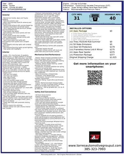 The 2021 Toyota Corolla APEX SE CVT (Natl) is a distinctive blend of style, performance, and practicality, reflecting a contemporary twist on a classic model. The exterior stands out with its striking Super White finish, enhanced by a contrasting Black Sand Pearl Roof, providing a sophisticated yet sporty appearance. This model is further enhanced by a sleek rear spoiler, adding an aerodynamic feature that complements its design.
