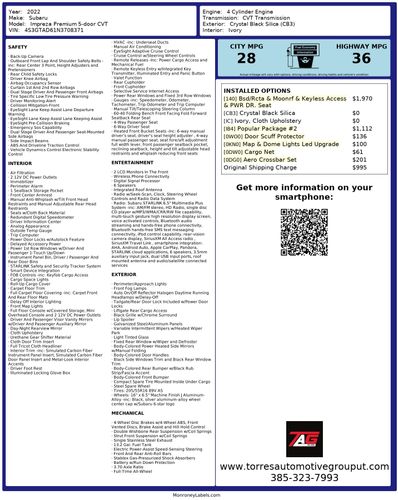 Enhancing its appeal, the Impreza comes with the popular package #2, which includes an auto-dimming mirror with a built-in compass and HomeLink for added convenience. The auto-dimming exterior mirror with an approach light offers additional safety and usability. For practicality and style, the aero crossbar set provides the capability to carry additional cargo. Whether you're navigating city streets or exploring off the beaten path, this Subaru Impreza is a versatile companion ready to accommodate your lifestyle.